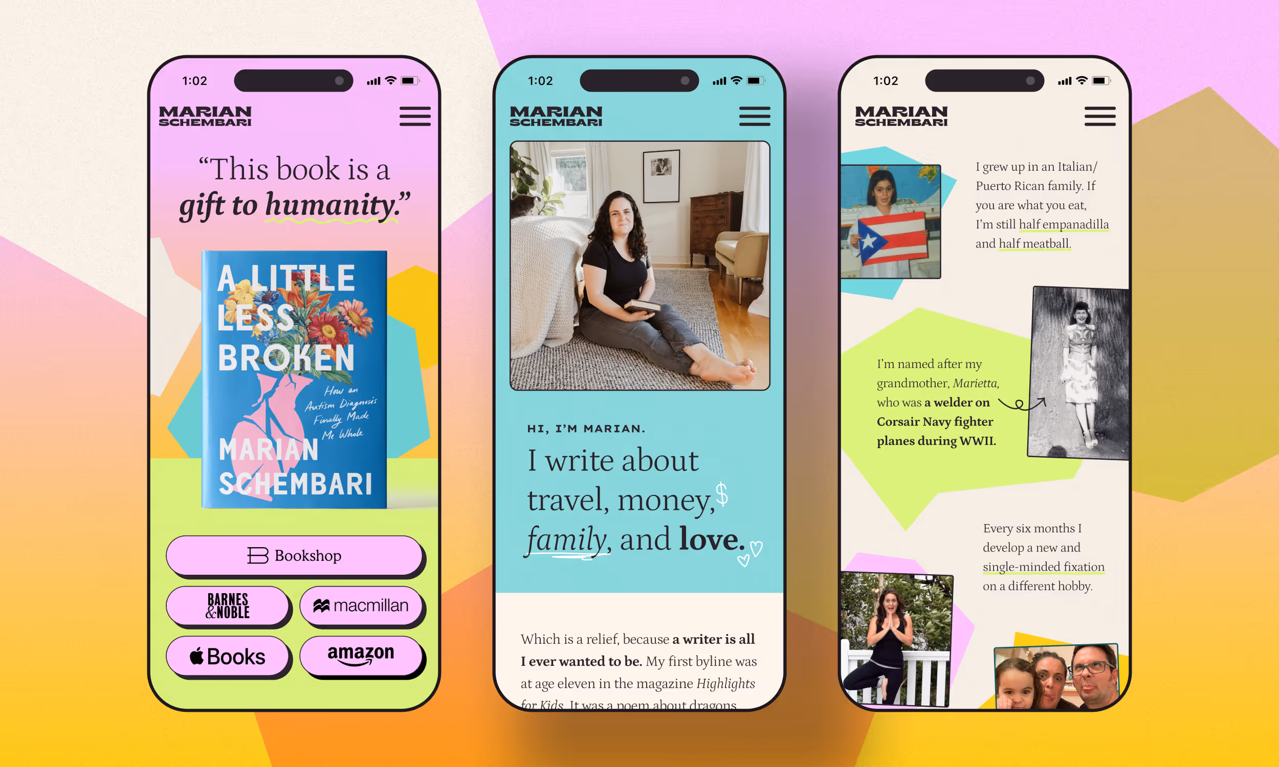 Marian Schembari is an author and essayist whose work has appeared in The New York Times, Cosmopolitan, Marie Claire, and Good Housekeeping. She approached me to lead her rebrand and website in time for the release of her inspiring, new memoir, A Little Less Broken: How an Autism Diagnosis Finally Made Me Whole.